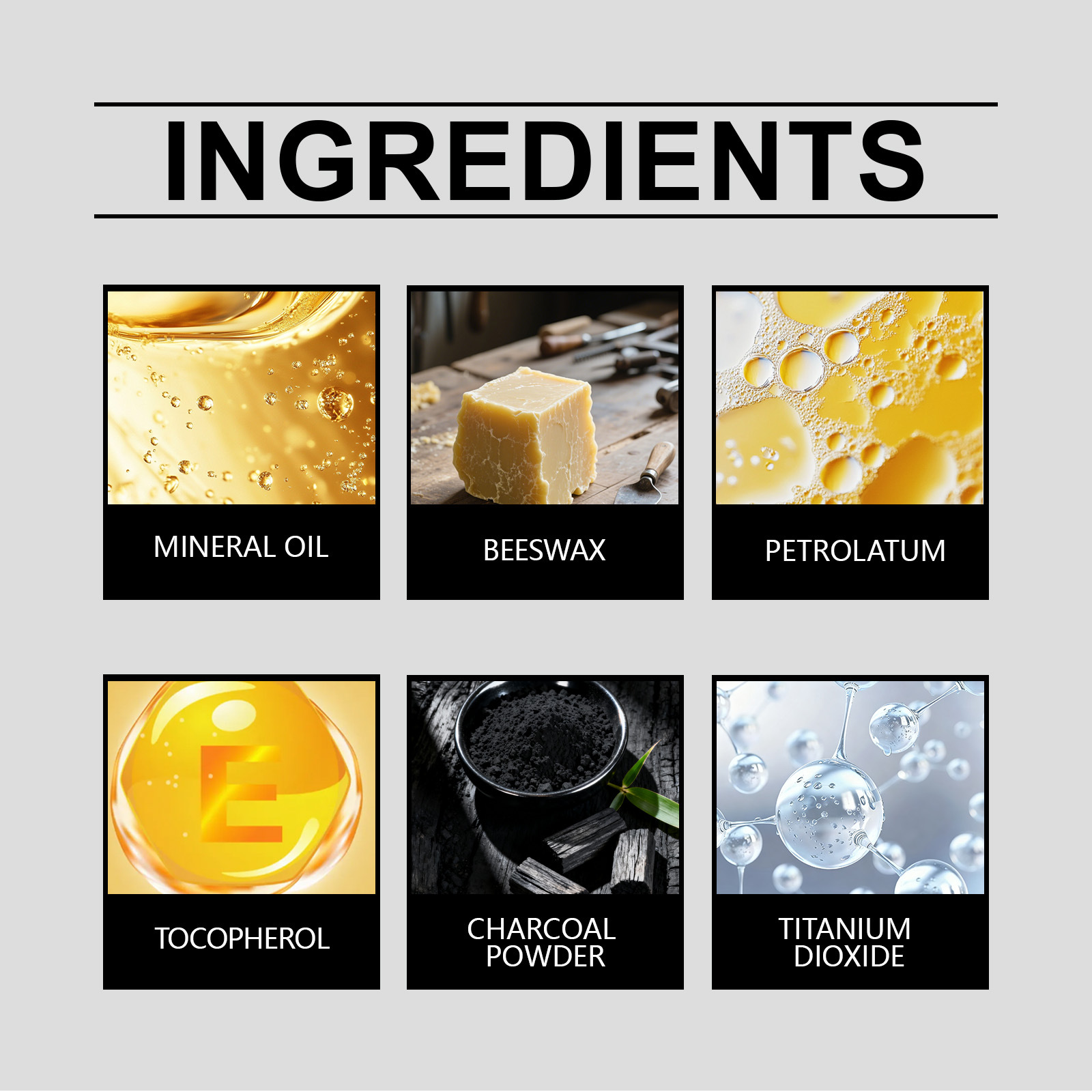 Ingredients: mineral oil, beeswax, petrolatum, tocopherol (vitamin E), carbon powder, titanium dioxide.